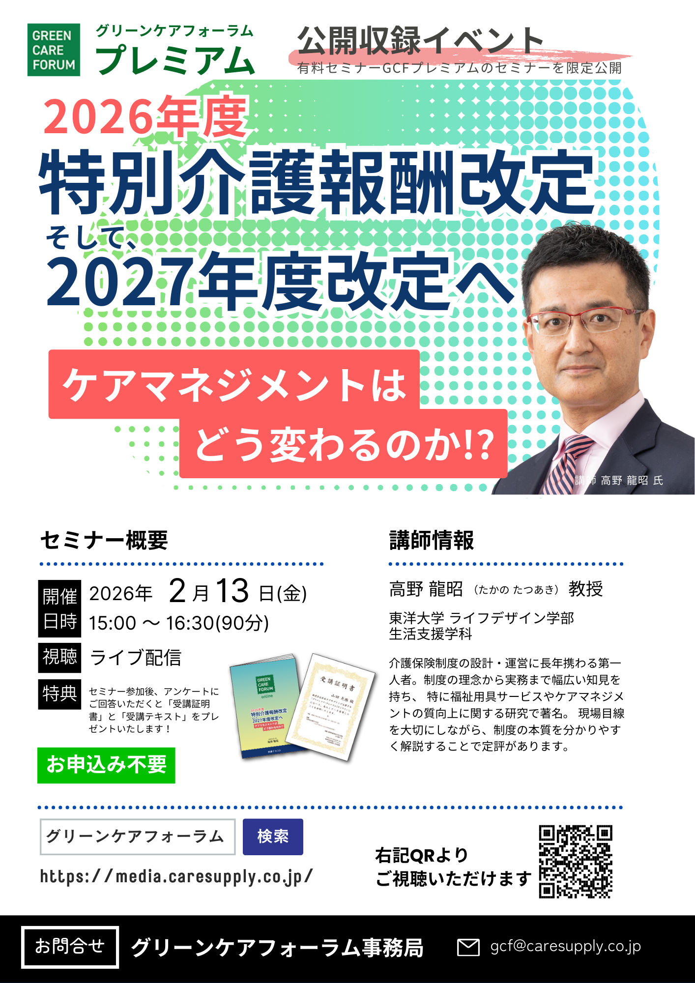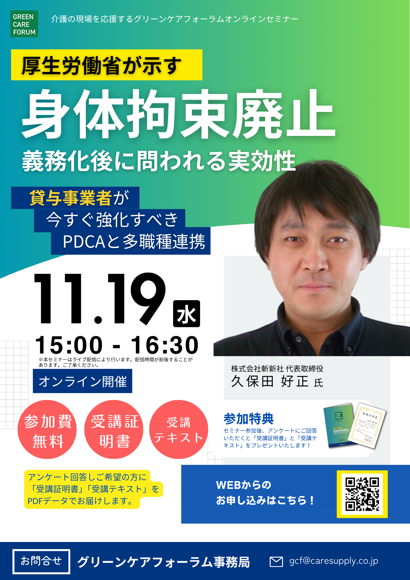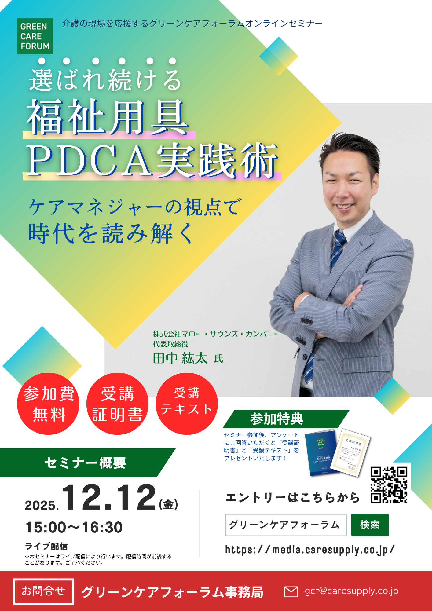 ケアマネジャー、福祉用具貸与事業者、介護施設、デイサービスなど介護に係わるみなさま向けに有益な情報を提供するセミナーを開催しております。介護事業者として抑えておくべき最新情報や定期的に改定になる介護制度の解説などを業界の著名人を講師にお迎えして分かりやすくお伝えいたします。最新情報をキャッチアップでき、参加費は無料、参加しやすいオンライン開催、セミナーの受講を証明する証明書の発行、セミナーテキストの配布など、参加しやすく、メリットの多い内容となっております。